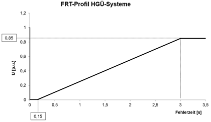 Ergänzend zu Art. 25 Abs. 1 und 6 der Verordnung (EU) 2016/1447 wird für HGÜ-Systeme festgelegt, dass das Spannungs-Zeit Profil für symmetrische und asymmetrische Fehler im Netz durch die Abbildung 2 festgelegt wird (die x-Achse entspricht der Zeit t in Sekunden, die y-Achse entspricht dem Verhältnis des tatsächlichen Werts der Spannung U zu ihrem Referenzwert 1 p.u.):