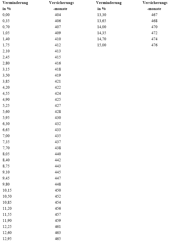 Das Ausmaß der Leistung ergibt sich aus der Leistung nach Z 1, wenn die Zahl der Versicherungsmonate den Wert von 476 Monaten übersteigt, sonst aus der Vervielfachung der Leistung nach Z 1 mit der Summe aus den Versicherungsmonaten und Zurechnungsmonaten, die den Wert von 476 Monaten nicht übersteigen darf, geteilt durch die Zahl der Versicherungsmonate.