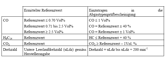 Der Hersteller definiert die Sollwerte für die Abgasnachuntersuchung. Die bei der Abgasnachuntersuchung einzuhaltenden Konzentrationen von Kohlenmonoxid, Kohlendioxid und Kohlenwasserstoffen sind wie folgt zu berechnen und auf der Abgastypenprüfbescheinigung einzutragen: