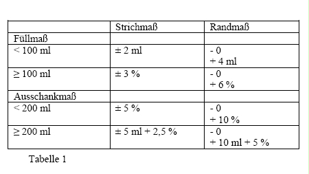 - 4.1. Umfüllmaße müssen so ausgelegt sein, dass eine den Fehlergrenzen entsprechende Veränderung des Inhalts eine Höhenänderung von mindestens 2 mm am Rand bzw. an der Füllstandsmarkierung bewirkt.