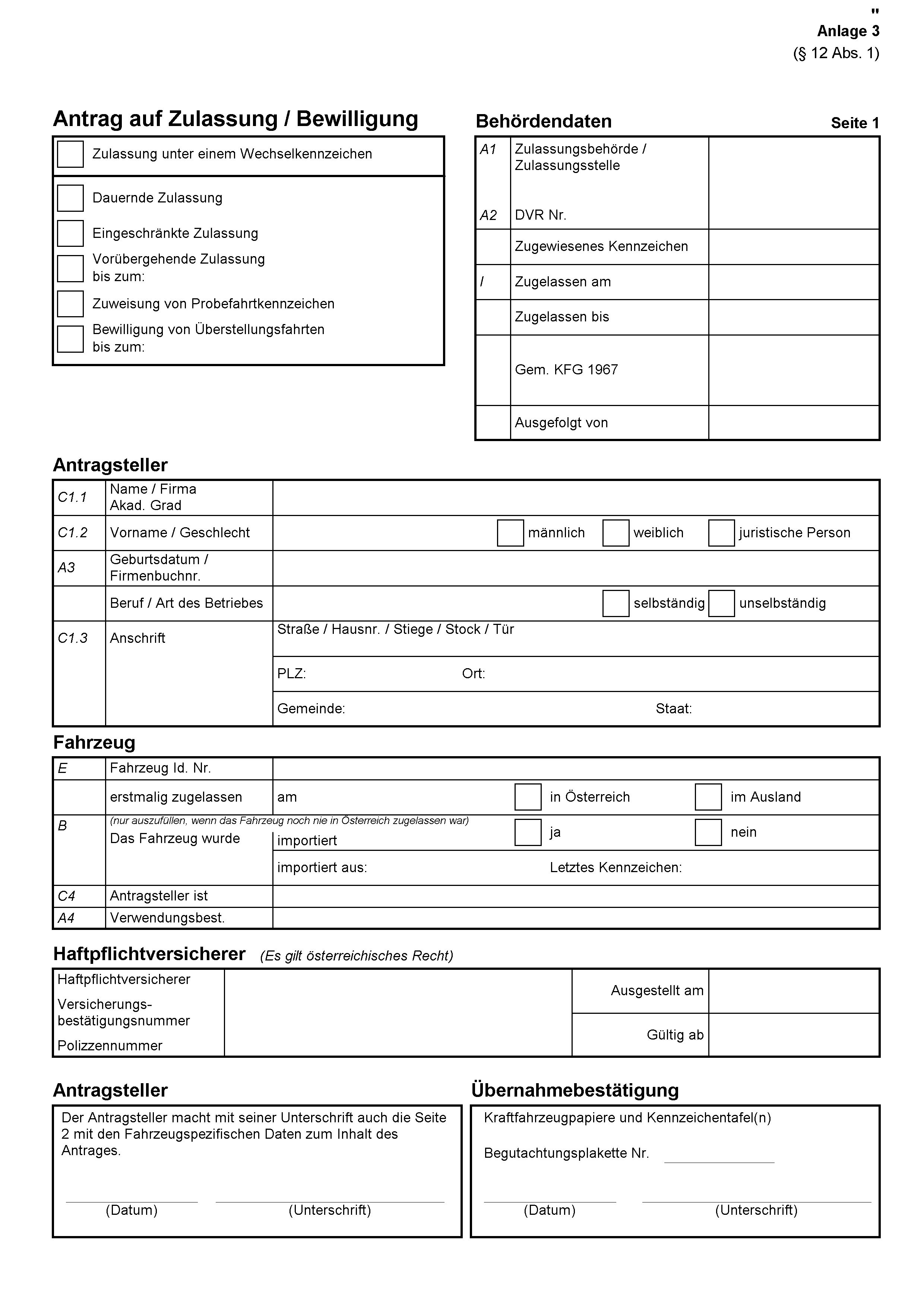 „§ 12. (1) Anträge auf Zulassung, auf vorübergehende Zulassung oder auf Erteilung von Bewilligungen zur Durchführung von Überstellungsfahrten von Kraftfahrzeugen oder Anhängern oder Anträge auf Ausgabe von Kennzeichentafeln für eingeschränkte Zulassung oder für Probefahrten sind bei den Zulassungsstellen mit einem Formblatt nach dem Muster der Anlage 3 einzubringen. Der Antragsteller hat durch Unterschrift die Richtigkeit der Angaben des Formblattes zu bestätigen.