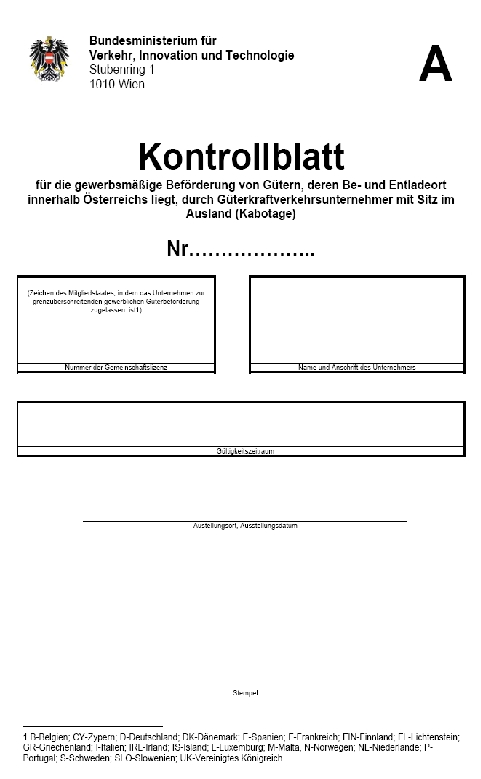 § 2. (1) Die während der Kabotage mitzuführenden Kontrollblätter nach dem Muster der Anlage 1 sind vom Bundesminister für Verkehr, Innovation und Technologie nach Mitteilung folgender Angaben auszugeben: