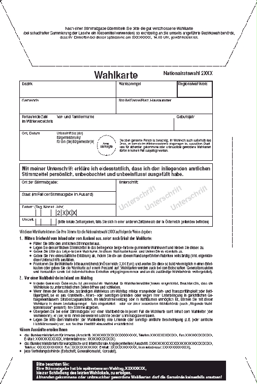 - 5. die Wahlkarte nicht spätestens am achten Tag nach dem Wahltag bis 14.00 Uhr bei der zuständigen Bezirkswahlbehörde eingelangt ist.