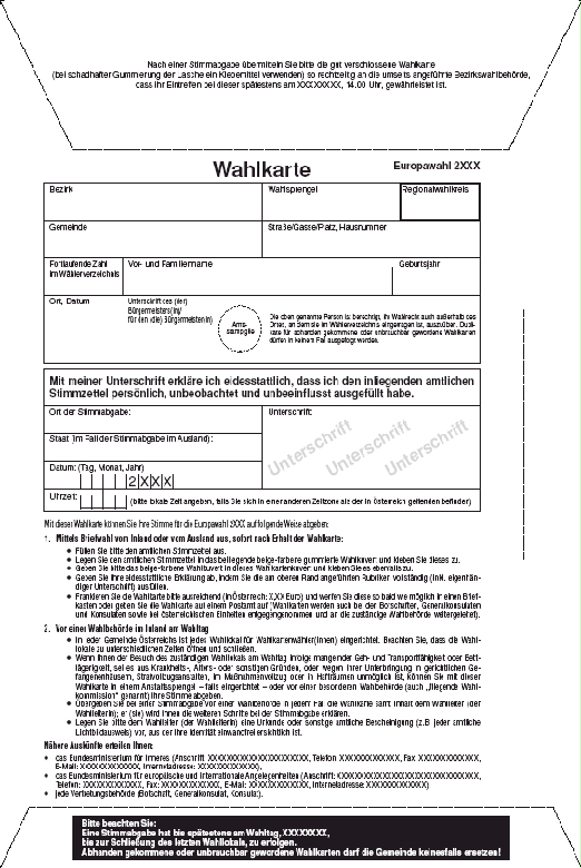 (2) Hierzu hat der Wähler den von ihm ausgefüllten amtlichen Stimmzettel in das beige-farbene Wahlkuvert zu legen, dieses zu verschließen und in die Wahlkarte zu legen. Sodann hat er auf der Wahlkarte durch Unterschrift eidesstattlich zu erklären, dass er den amtlichen Stimmzettel persönlich, unbeobachtet und unbeeinflusst ausgefüllt hat, anschließend die Wahlkarte zu verschließen und so rechtzeitig im Postweg, bei einer Stimmabgabe im Ausland allenfalls im Weg einer österreichischen Vertretungsbehörde oder einer österreichischen Einheit, an die zuständige Bezirkswahlbehörde zu übermitteln, dass die Wahlkarte dort spätestens am achten Tag nach dem Wahltag bis 14.00 Uhr einlangt. Aus der Wahlkarte mit der eidesstattlichen Erklärung haben die Identität des Wählers sowie der Ort und der Zeitpunkt (Datum und Uhrzeit) des Zurücklegens des verschlossenen beige-farbenen Wahlkuverts in die Wahlkarte hervorzugehen. Die eidesstattliche Erklärung muss vor Schließen des letzten Wahllokals in Österreich abgegeben worden sein.