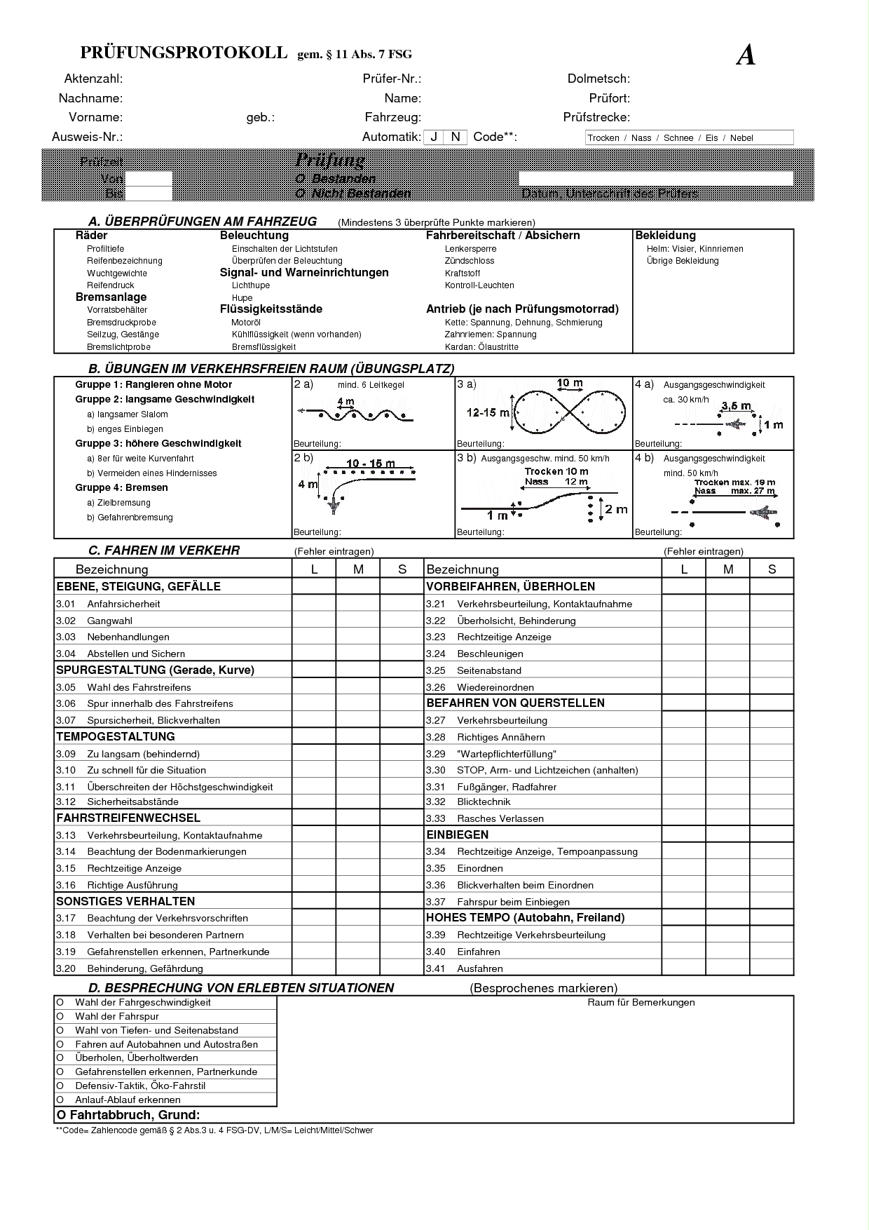„(3) Im Rahmen der Übungen im verkehrsfreien Raum (Abs. 1 Z 2) für die Klassen A, C, D, B+E, C+E, D+E, F sowie die Unterklassen C1 und C1+E sind die in Abschnitt B. des Prüfungsprotokolls zur jeweiligen Klasse gemäß der Anlage enthaltenen Übungen durchzuführen. Bei der praktischen Fahrprüfung für die Klasse B sind von den in Abschnitt B. des Prüfungsprotokolls enthaltenen Übungen mindestens drei zu überprüfen, wobei das Umkehren und die Parklücke jedenfalls durchzuführen sind. Bei den Übungen für die Klasse A, bei denen im Teil B. des Prüfungsprotokolles eine Mindestgeschwindigkeit angegeben ist, ist die jeweils gefahrene Geschwindigkeit mit einer Geschwindigkeitsmessanlage zu überprüfen. Die Fahrübungen für alle Klassen können auch auf einem geeigneten Übungsplatz durchgeführt werden.“