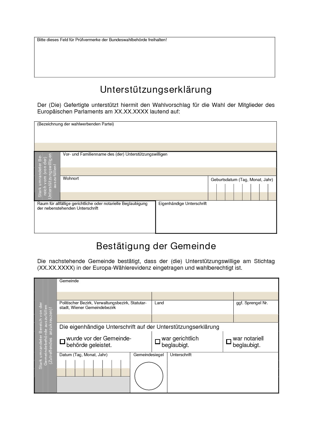 „Der Wahlvorschlag muss von wenigstens drei Abgeordneten zum Nationalrat oder von wenigstens einem auf Grund dieses Bundesgesetzes bei der letzten Wahl zum Europäischen Parlament gewählten Mitglied unterschrieben oder von 2 600 Personen, die am Stichtag in der Europa-Wählerevidenz eingetragen und wahlberechtigt (§ 10) waren, unterstützt sein; hat ein Abgeordneter oder ein Mitglied mehrere Wahlvorschläge unterschrieben, so ist nur jene Unterschrift gültig, die sich auf dem ersteingebrachten Antrag befindet.“