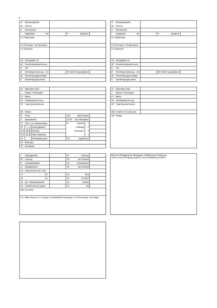 „Bei einer Zulassungsbescheinigung Teil I im Chipkartenformat erfordert jede Veränderung der Eintragungen die Beantragung einer neuen Zulassungsbescheinigung Teil I im Chipkartenformat, sofern nicht der Umstieg auf eine Zulassungsbescheinigung Teil I im Papierformat beantragt wird. Nach einer Abmeldung oder sonst ungültig gewordenen Zulassungsbescheinigungen Teil I im Chipkartenformat werden diese mittels Lochung entwertet und sodann dem Antragsteller wieder ausgefolgt. Die Lochung muss derart erfolgen, dass der Mikrochip dabei unversehrt bleibt.“
