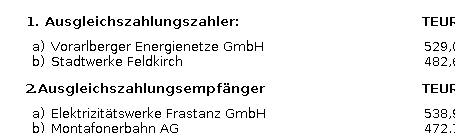 (6) Für den Netzbereich Vorarlberg werden folgende Ausgleichszahlungen festgelegt: