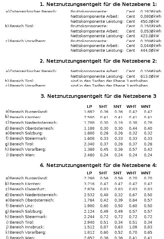 § 4. (1) Das von Entnehmern pro Zählpunkt zu entrichtende Netznutzungsentgelt wird wie folgt bestimmt. Die Entgelte für Entnehmer werden, sofern nicht besonders ausgewiesen, in Übereinstimmung mit § 52 Abs. 2 ElWOG 2010 in Cent/kW, in Cent/kWh bzw. in Form einer Jahresfixpauschale angegeben.