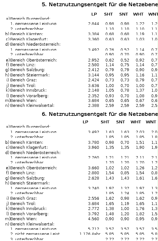 - 2. die Abkürzung LP wird für Leistungspreis verwendet, wobei die Preisansätze auf die Leistungseinheit „ein kW“ bezogen sind. Der Leistungspreis ist auf die Verrechnungsleistung der Netznutzung bezogen. Für Netzbenutzer in den Ebenen 6 oder 7, bei denen keine Messung der Leistung vorgenommen wird, wird für das leistungsbezogene Netznutzungsentgelt eine Pauschale bestimmt;