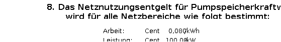 - 6. die Abkürzung WNT wird für Winter Niedertarifzeit verwendet. Winter ist dabei der Zeitraum vom 1. Oktober 00.00 Uhr bis 31. März 24.00 Uhr des Folgejahres. Die Niedertarifzeit ist die Uhrzeit von 22.00 Uhr bis 06.00 Uhr des Folgetages. Das Entgelt ist auf die elektrische Arbeit bezogen, wobei die Preisansätze auf die Arbeitseinheit „eine kWh“ bezogen sind;