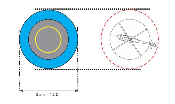 (4) Ist vorgesehen, dass ein Hubschrauber auf einer Abstellfläche Drehungen durchführt, muss ein Sicherheitsstreifen die Fläche der Abstellfläche ganzseitig umschließen. Die Größe der Abstellfläche inklusive Sicherheitsstreifen muss mindestens 2mal die Größe des Hubschraubers (D) aufweisen.