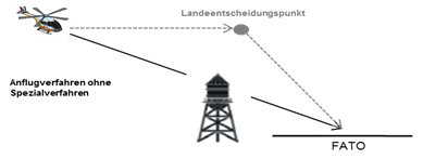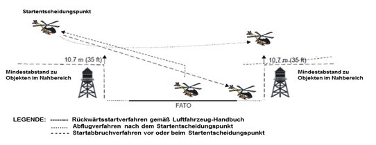 (5) Bei der Festlegung des Rückwärtsstartverfahrens ist zu berücksichtigen, dass nach Erreichung des TDP ein Vorwärtsflug mit einem angemessenen Sinkflug zur Geschwindigkeitsaufnahme durchgeführt wird. Dabei ist die Hindernissituation nicht nur im Bereich des Rückwärtsfluges, sondern auch im Vorwärtsflug zu berücksichtigen. Daher sind die für das Rückwärtsstartverfahren angegeben Flächen unter der Bedingung anzuwenden, dass die untere Begrenzung der beschriebenen Flächen zumindest 35ft über sämtlichen Objekten in Abhängigkeit der jeweiligen Höhe und Lage der Entscheidungshöhe sowie der Situation der Objekte im Vorwärtsflugteil verbleibt. Als Objekte gelten insbesondere Bauten, Bäume, Kräne, Antennen, Blitzschutzanlagen, Dachaufbauten sowie technische Geräte am Dach eines Gebäudes, Leitungen, Seil- und Drahtverspannungen.
