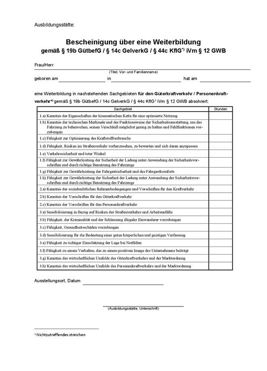Bescheinigung über eine Weiterbildung gemäß § 12 Abs. 5 GWB