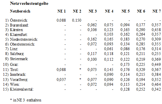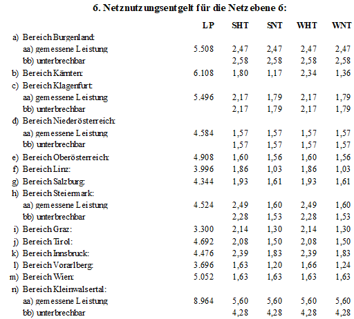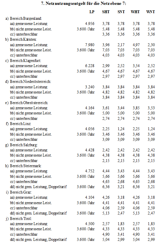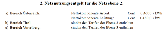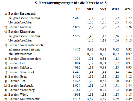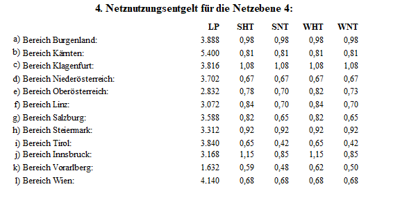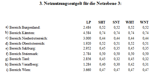 „(2) Für die Netznutzung der Netzebene 3 der Austrian Power Grid AG sind folgende Jahresbeträge (in tausend Euro – TEUR) in zwölf gleichen Teilbeträgen monatlich zu leisten, wobei alle Rechnungen am 15. des dem Leistungserbringungsmonat folgenden Monats fällig sind: