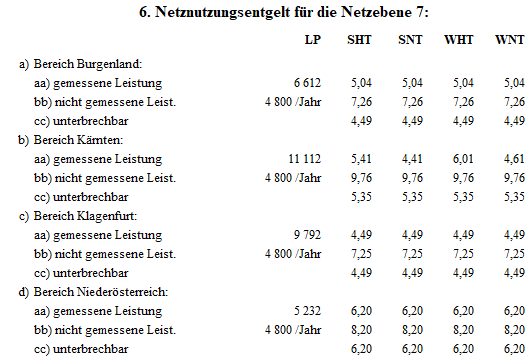 „(2) Für die Netznutzung der Netzebene 3 der Austrian Power Grid AG sind folgende Jahresbeträge (in tausend Euro – TEUR) in zwölf gleichen Teilbeträgen monatlich zu leisten, wobei alle Rechnungen am 15. des dem Leistungserbringungsmonat folgenden Monats fällig sind: