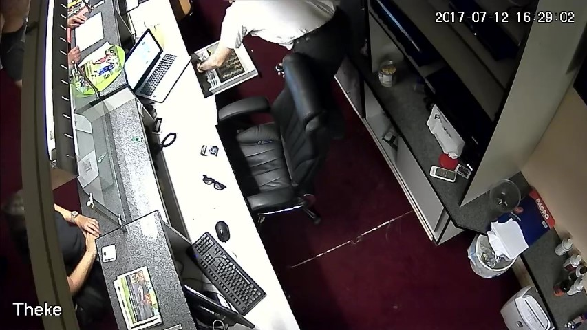 F.12. 16:28:01 Uhr: Finanzpolizist weist D an, die Geldlade des Tresens zu öffnen.