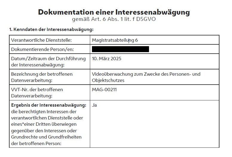 Die Datenschutzbehörde kommt aufgrund vorgenannter Erwägungen daher zu dem Ergebnis, dass es betreffend Kamera [Anmerkung Bearbeiter/in: Bezugnahme auf die im Spruch aufgezählten Standorte einer Videoüberwachung auf Ersuchen der Stadt Wien aus Sicherheitserwägungen entfernt] sowohl an der Erforderlichkeit der Datenverarbeitung als auch an überwiegenden Interessen der MA 6 gegenüber Betroffeneninteressen mangelt, weshalb eine Berufung auf Art. 6 Abs. 1 lit. f DSGVO ausscheidet.