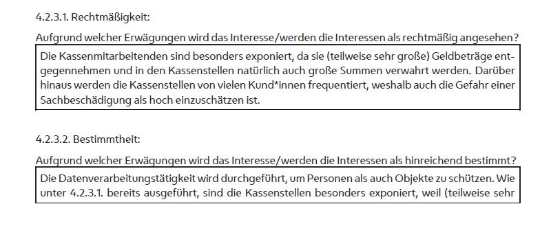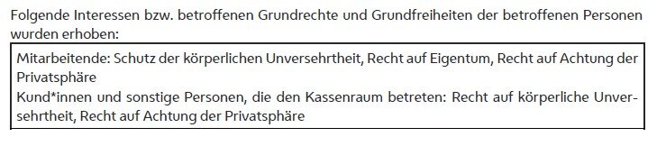 Einerseits werden die Warte- und Kassenbereiche außen ohnedies bereits von zahlreichen Videokameras überwacht (vgl. hierzu Punkt D.3.2.a.), womit die höher gefährdeten (Eingangs- und Kund*innen) Bereiche nach Ansicht der Datenschutzbehörde ausreichend geschützt sind.