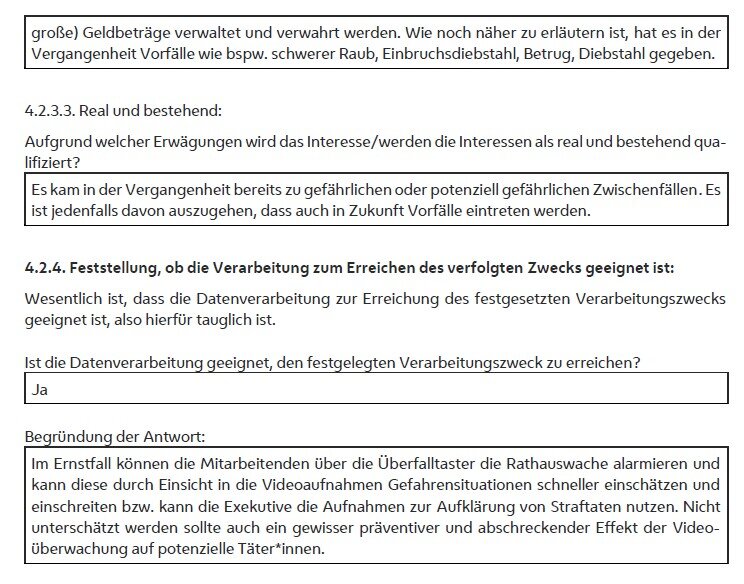Weiters ist der unter Punkt C.14. ersichtlichen „Dokumentation einer Interessensabwägung“ zu entnehmen, dass sich diese Maßnahme aus Sicht der MA 6 auch als geeignet erweist, da die Mitarbeitenden über die Überfalltaster die Rathauswache alarmieren und diese durch Einsicht in die Videoaufnahmen Gefahrensituationen schneller einschätzen können. Außerdem könne die Exekutive die Aufnahmen zur Aufklärung von Straftaten nutzen. Auch wohne der Videoüberwachung ein gewisser Abschreckungseffekt inne.