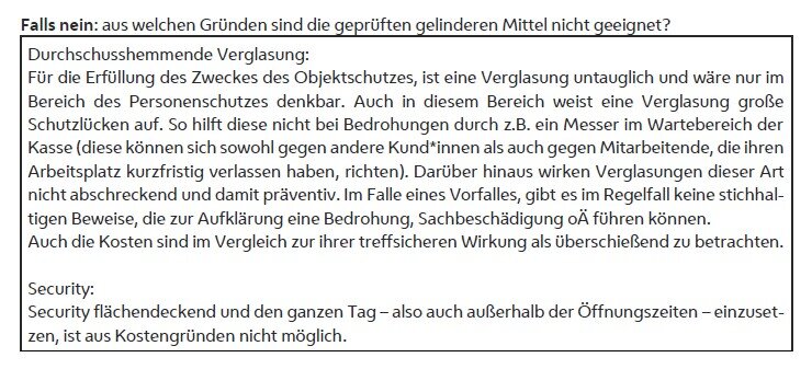 Außerdem sind dieser Dokumentation der MA 6 auch deren Prüfung gelinderer Mittel zu entnehmen: Für die Erfüllung des Zweckes des Objektschutzes sei eine Verglasung untauglich und wäre nur im Bereich des Personenschutzes denkbar. Auch in diesem Bereich weise eine Verglasung große Schutzlücken auf. So helfe diese nicht bei Bedrohungen durch z.B. ein Messer im Wartebereich der Kasse (diese können sich sowohl gegen andere Kund*innen als auch gegen Mitarbeitende, die ihren Arbeitsplatz kurzfristig verlassen haben, richten). Darüber hinaus wirkten Verglasungen dieser Art nicht abschreckend und damit präventiv. Im Falle eines Vorfalles gebe es im Regelfall keine stichhaltigen Beweise, die zur Aufklärung eine Bedrohung, Sachbeschädigung oÄ führen können. Auch die Kosten seien im Vergleich zur ihrer treffsicheren Wirkung als überschießend zu betrachten. Security flächendeckend und den ganzen Tag – also auch außerhalb der Öffnungszeiten – einzusetzen, sei aus Kostengründen nicht möglich.