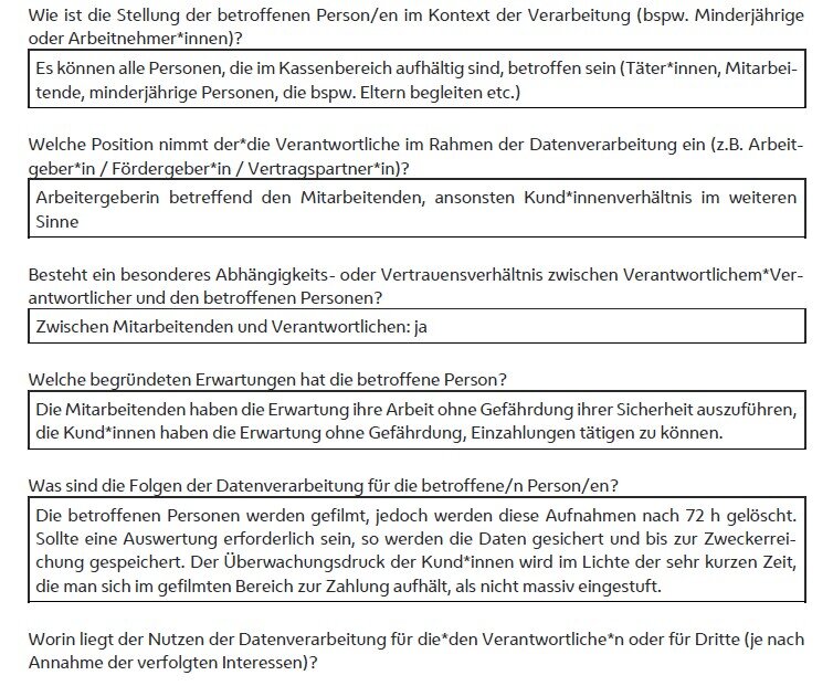 3. Erfüllung rechtlicher Sorgfaltspflichten bzw. Verantwortungsschutz: Das ist der sich insbesondere aus Verkehrssicherungspflichten bzw. aus der Vertragshaftung gegenüber Kundinnen und Kunden ergebende Schutz von Personen und von fremdem Eigentum, wozu auch die zur Gewährleistung der Datensicherheit erforderliche Videoüberwachung zählt;