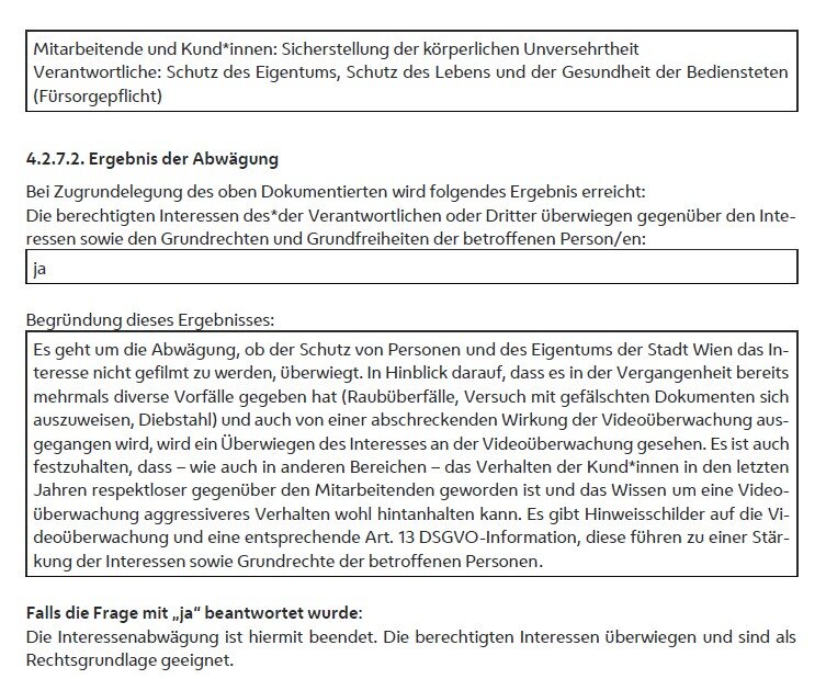 Die MA 6 führte zum Vorliegen von berechtigten Interessen [Voraussetzung i)] aus, dass es in der Vergangenheit bereits zu Vorfällen wie etwa bewaffneten Raubüberfällen und Bedrohungen durch Bürger*innen gekommen sei. Außerdem sei die Gefährdungslage schon aufgrund der hohen Kund*innenfrequenz bei gleichzeitiger Verwaltung von großen Mengen an Bargeld erhöht.