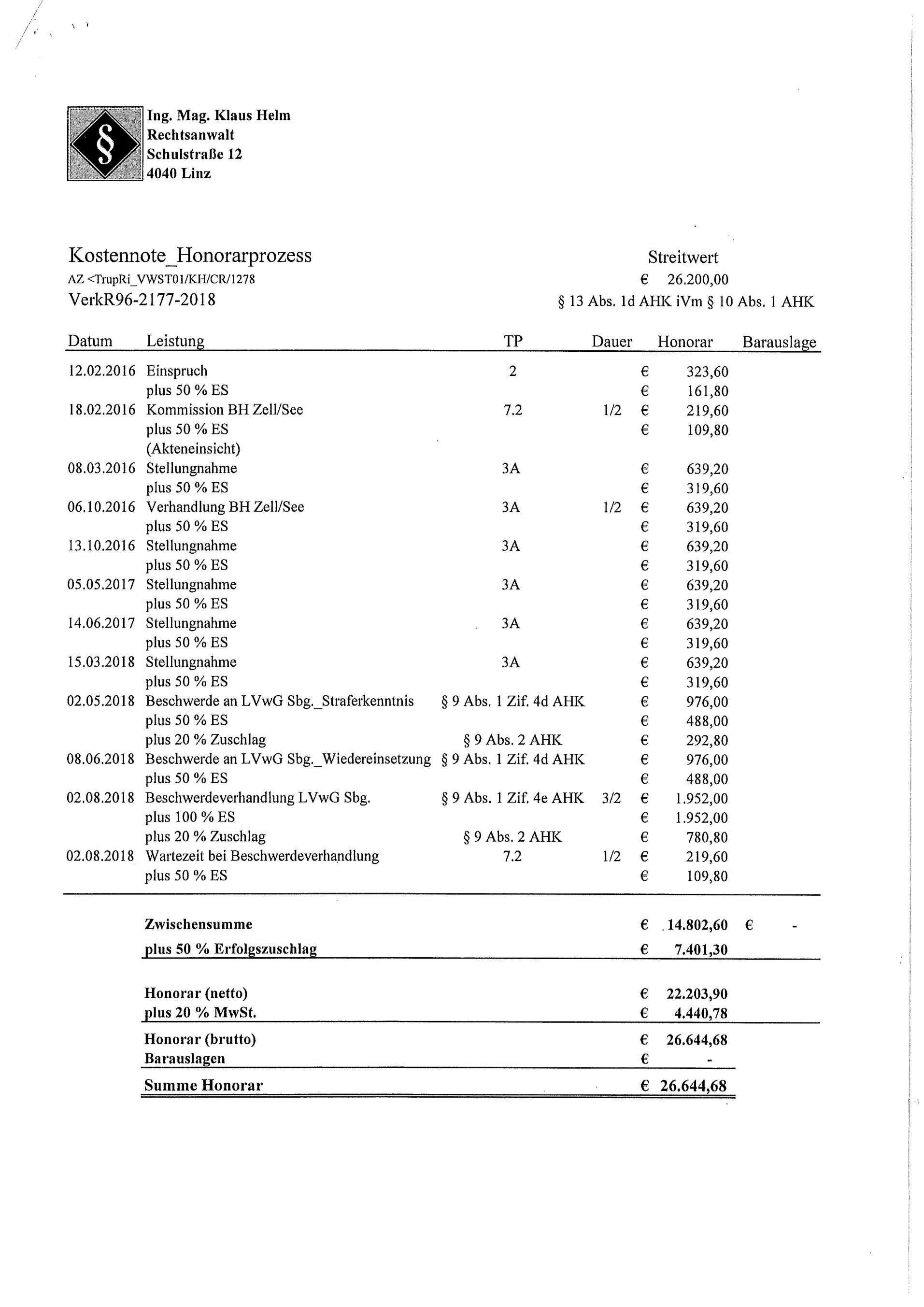 [29] Am 14. November 2018 richtete der Klagevertreter nachstehendes Schreiben an die Klägerin: „... Ich darf Ihnen daher die Kosten meines Einschreitens laut beiliegender tariflicher Kostennote mit dem Betrag von € 24.712,20 bekanntgeben. Aufgrund der Deckungszusage Ihrer RS‑Versicherung für die Verteidigung im Verwaltungsstrafverfahren sind die Kosten weitestgehend, nämlich im Betrag von € 22.077,00 von der RS‑Versicherung zu tragen ...“