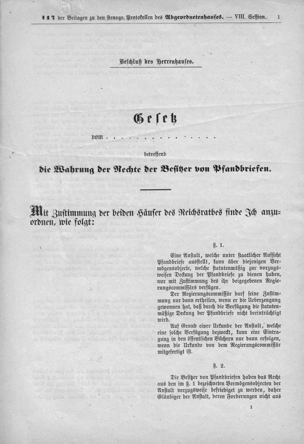 <i>Heindler/Wolfbauer</i> in <i>Heindler/Wolfbauer</i> (Hrsg), PfandBG - Pfandbriefgesetz (2022) Anlage 11: Beschluß des Herrenhauses vom Gesetz betreffend die Wahrung der Rechte der Besitzer von Pfandbriefen, Seite 688