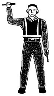 (Die abwärts gerichteten Arme zeigen mit den Handflächen zum Boden, dann wird eine Hand wiederholt aufwärts und abwärts bewegt, die andere Hand bleibt in Ruhestellung. Wird die linke Hand bewegt, ist das Triebwerk – beziehungsweise sind die Triebwerke – rechts zu drosseln; wird die rechte Hand bewegt, ist das Triebwerk – beziehungsweise sind die Triebwerke – links zu drosseln.)