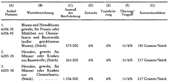 Anhang I Memorandum of Understanding über den Export von bestimmten Textilprodukten aus Baumwolle und aus Chemiefasern aus Indien zum Import nach Österreich