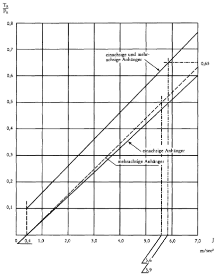 3.4 | Die vorgeschriebene Bremskraft des Anhängers von mindestens 50% seines Höchstgewichtes muß bei diesem Höchstgewicht bei einer mittleren Vollverzögerung einer Fahrzeugkombination von Zugfahrzeug und einachsigem Anhänger von höchstens 5,9 m/s2 und bei einer mittleren Vollverzögerung einer Fahrzeugkombination von Zugfahrzeug und mehrachsigem Anhänger von höchstens 5,6 m/s2 erreicht werden. Anhänger mit Doppelachsen, deren Radstand nicht mehr als 1 m beträgt, gelten im Sinne dieser Vorschriften als einachsige Anhänger. Darüber hinaus sind die in der Anlage zu diesem Anhang angegebenen Grenzwerte zu beachten. Wird die Bremskraft stufenweise geregelt, so müssen die Stufen in dem in der Anlage zu diesem Anhang angegebenen Bereich liegen. |
