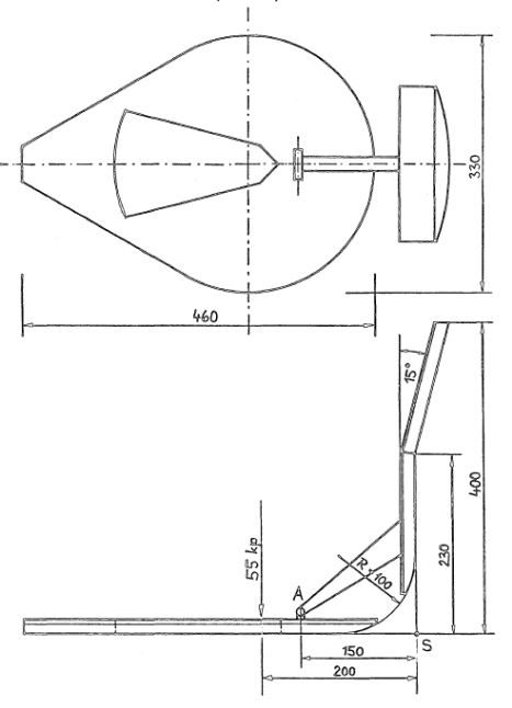 - Hiefür ist eine Prüfeinrichtung gemäß Z II Abbildungen 1 und 2 zu verwenden. Diese ist auf den Sitz zu legen und mit 550 N in einem Abstand von 5 cm vor dem Gelenk A zu belasten, wobei der Rückenteil leicht gegen die Lehne des Sitzes gedrückt werden muß. Der in der Z II Abbildungen 1 und 2 eingezeichnete Punkt S dient als Sitzbezugspunkt. Der Sitzbezugspunkt S ist der Punkt in der Längsmittelebene des Sitzes, in dem sich eine zur Längsmittelebene senkrechte Tangentialebene an die Beckenstütze mit der Horizontalebene schneidet, die die Sitzoberfläche 15 cm vor der angeführten Tangentialebene schneidet (Z. II Abbildung 2). Im Sinne der Bestimmungen des § 19a ist zu messen als