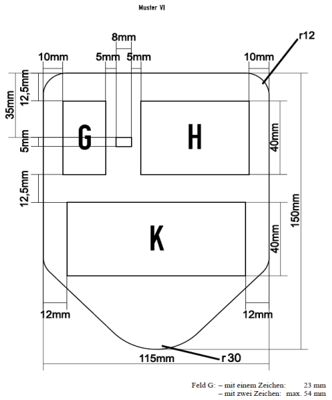 BI | Ia, IIIa, IV ,V | Bundeswappen oder Wappen des Bundeslandes mit unterhalb ausgeschriebenem Namen des Bundeslandes (Blockbuchstaben. Höhe: 4 mm oder 5 mm je nach Wortlänge). Wappen und ausgeschriebenem Namen des Bundeslandes auf ebener Hochprägefläche (Prägehöhe 0,2 mm bis 0,5 mm) aufgebracht. Nur bei Kennzeichentafeln ohne Wappen: Hochprägung P (Muster Ib) | |
