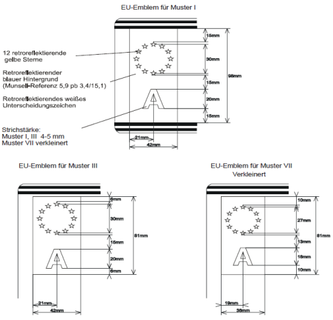 EU | I, III, VII, VIII | EU-Emblem, (siehe Muster EU) | |