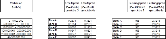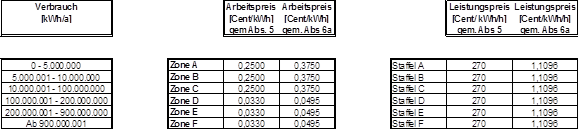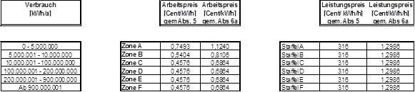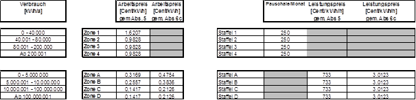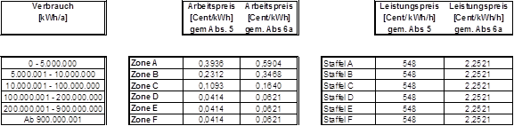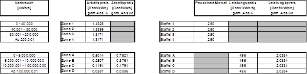 (4) Die Entgelte werden verbrauchs- und leistungsabhängig in Zonen bzw. Staffeln festgelegt. Die Zonen 1-4 sowie die Staffeln 1-4 kommen für nicht leistungsgemessene Anlagen, die Zonen A-F sowie die Staffeln A-F kommen für leistungsgemessene Anlagen zur Anwendung. Der Arbeitspreis wird für die Zonen 1-4 bzw. A-F so festgelegt, dass je nach Jahresverbrauch alle darunter liegenden Zonen durchlaufen werden. Der Leistungspreis wird in den Staffeln A-F bzw. 1-4 festgelegt, wobei der Leistungspreis der Staffel 1-4 als Pauschale bestimmt wird. Die Pauschalen der Staffeln 1-4 sind grundsätzlich auf einen Zeitraum von einem Monat zu beziehen. Ist der Abrechnungszeitraum kürzer oder länger als ein Monat, sind die Pauschalen der Staffeln 1-4 tageweise zu aliquotieren. Es können Zonen bzw. Staffeln zusammengefasst werden, sodass mehrere Zonen bzw. Staffeln denselben Arbeitspreis bzw. denselben Leistungspreis aufweisen können. Die Rechnungslegung hat entsprechend den tatsächlichen Ableseintervallen (§ 15 Abs. 3) zu erfolgen, § 126 Abs. 2 GWG 2011 bleibt davon unberührt.