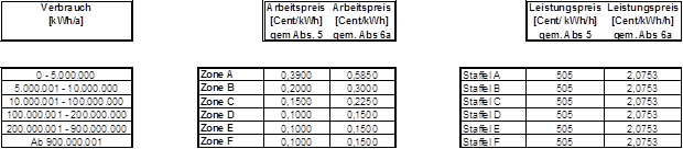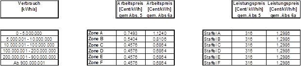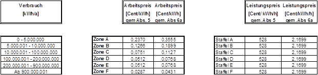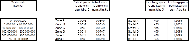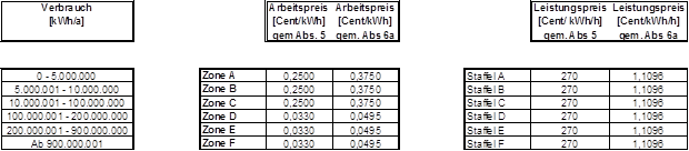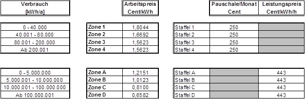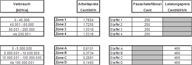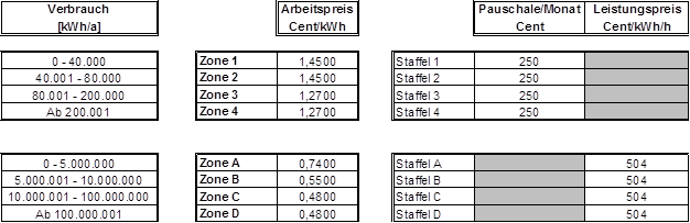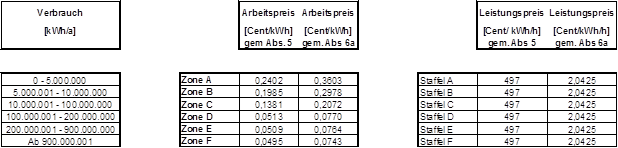 (4) Die Entgelte werden verbrauchs- und leistungsabhängig in Zonen bzw. Staffeln festgelegt. Die Zonen 1-4 sowie die Staffeln 1-4 kommen für nicht leistungsgemessene Anlagen, die Zonen A-F sowie die Staffeln A-F kommen für leistungsgemessene Anlagen zur Anwendung. Der Arbeitspreis wird für die Zonen 1-4 bzw. A-F so festgelegt, dass je nach Jahresverbrauch alle darunter liegenden Zonen durchlaufen werden. Der Leistungspreis wird in den Staffeln A-F bzw. 1-4 festgelegt, wobei der Leistungspreis der Staffel 1-4 als Pauschale bestimmt wird. Die Pauschalen der Staffeln 1-4 sind grundsätzlich auf einen Zeitraum von einem Monat zu beziehen. Ist der Abrechnungszeitraum kürzer oder länger als ein Monat, sind die Pauschalen der Staffeln 1-4 tageweise zu aliquotieren. Es können Zonen bzw. Staffeln zusammengefasst werden, sodass mehrere Zonen bzw. Staffeln denselben Arbeitspreis bzw. denselben Leistungspreis aufweisen können. Die Rechnungslegung hat entsprechend den tatsächlichen Ableseintervallen (§ 15 Abs. 3) zu erfolgen, § 126 Abs. 2 GWG 2011 bleibt davon unberührt.