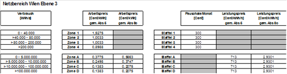 (4) Die Entgelte werden verbrauchs- und leistungsabhängig in Zonen bzw. Staffeln festgelegt. Die Zonen 1-4 sowie die Staffeln 1-4 kommen für nicht leistungsgemessene Anlagen, die Zonen A-F sowie die Staffeln A-F kommen für leistungsgemessene Anlagen zur Anwendung. Der Arbeitspreis wird für die Zonen 1-4 bzw. A-F so festgelegt, dass je nach Jahresverbrauch alle darunter liegenden Zonen durchlaufen werden. Der Leistungspreis wird in den Staffeln A-F bzw. 1-4 festgelegt, wobei der Leistungspreis der Staffel 1-4 als Pauschale bestimmt wird. Die Pauschalen der Staffeln 1-4 sind grundsätzlich auf einen Zeitraum von einem Monat zu beziehen. Ist der Abrechnungszeitraum kürzer oder länger als ein Monat, sind die Pauschalen der Staffeln 1-4 tageweise zu aliquotieren. Es können Zonen bzw. Staffeln zusammengefasst werden, sodass mehrere Zonen bzw. Staffeln denselben Arbeitspreis bzw. denselben Leistungspreis aufweisen können. Die Rechnungslegung hat entsprechend den tatsächlichen Ableseintervallen (§ 15 Abs. 3) zu erfolgen, § 126 Abs. 2 GWG 2011 bleibt davon unberührt.
