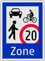 - Dieses Zeichen zeigt den Beginn einer Begegnungszone an und bedeutet, dass hier die besonderen Bestimmungen des § 76c gelten. Wurde in der Begegnungszone die erlaubte Höchstgeschwindigkeit gemäß § 76c Abs. 6 auf 30 km/h erhöht, ist auf dem Zeichen die Zahl „20“ durch die Zahl „30“ zu ersetzen.