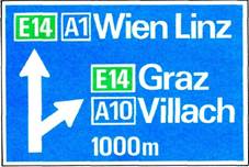 Diese Zeichen zeigen den weiteren Verlauf einer Autobahn oder Autostraße und die nächste Ausfahrt an. Ein Zeichen nach a) ist etwa 1000 m, ein Zeichen nach b) etwa 700 m oder, wenn ein Zeichen nach c) nicht angebracht wird, etwa 500 m, ein Zeichen nach c) etwa 400 m vor dem Beginn einer Ausfahrt aus einer Autobahn oder Autostraße anzubringen; ein Zeichen nach d) ist etwa 1000 m vor dem Beginn einer Ausfahrt zu einer anderen Autobahn oder Autostraße anzubringen.