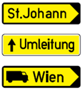 Diese Zeichen zeigen eine Umleitung des Verkehrs an. Ist auf einem solchen Zeichen ein Symbol für eine bestimmte Fahrzeugart angebracht, so bedeutet dies, dass die Umleitung nur für Fahrzeuge der betreffenden Fahrzeugart gilt.
