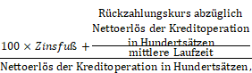 4. d) die prozentuelle Gesamtbelastung bei Anleihen, Darlehen und sonstigen Krediten inländischer Währung unter Zugrundelegung der folgenden Formel nicht mehr als das Zweieinhalbfache des im Zeitpunkt der Kreditoperation geltenden Zinsfußes für Eskontierungen der Oesterreichischen Nationalbank (§ 48 Abs. 2 des Nationalbankgesetzes 1955, BGBl. Nr. 184, in der Fassung des Bundesgesetzes BGBl. Nr. 276/1969) beträgt;