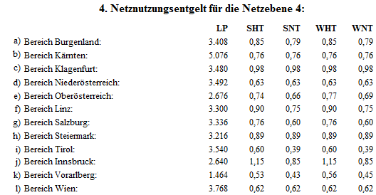 (2) Für die Netznutzung der Netzebene 3 der Austrian Power Grid AG sind folgende Jahresbeträge (in tausend Euro – TEUR) in zwölf gleichen Teilbeträgen monatlich zu leisten, wobei alle Rechnungen am 15. des dem Leistungserbringungsmonat folgenden Monats fällig sind: