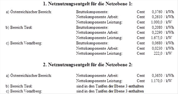 - a) Das Netznutzungsentgelt für Erbringer von Regelreserve Sekundärregelung, Tertiärregelung) wird für Arbeit und zusätzliche Leistung gemäß § 52 Abs. 1 ElWOG 2010, die durch die Aktivierung der Regelenergiereserven verursacht werden, für alle Netzebenen wie folgt bestimmt und kommt auf Antrag des Regelreserveanbieters beim Netzbetreiber zur Anwendung: