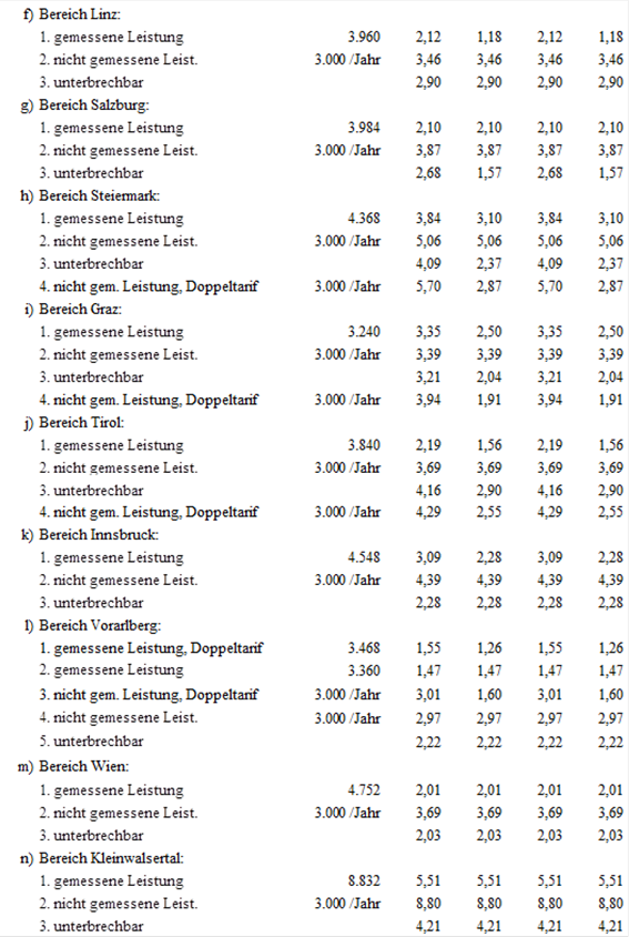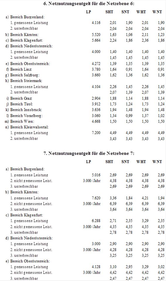 (2) Für die Netznutzung der Netzebene 3 der Austrian Power Grid AG sind folgende Jahresbeträge (in tausend Euro – TEUR) in zwölf gleichen Teilbeträgen monatlich an die Austrian Power Grid AG zu leisten.