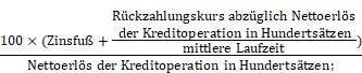 - d) die prozentuelle Gesamtbelastung bei Anleihen, Darlehen und sonstigen Krediten in inländischer Währung unter Zugrundelegung der folgenden Formel nicht mehr als das Zweieinhalbfache des im Zeitpunkt der Kreditaufnahme geltenden Zinsfußes für Eskontierungen der Oesterreichischen Nationalbank (Anm.: Basiszinssatzes) (§ 48 Abs. 2 des Nationalbankgesetzes 1955, BGBl. Nr. 184, in der Fassung des Bundesgesetzes BGBl. Nr. 276/1969) beträgt: