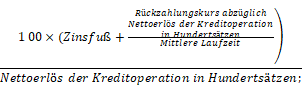 - b) die prozentuelle Gesamtbelastung bei Anleihen, Darlehen und sonstigen Krediten in inländischer Währung unter Zugrundelegung der folgenden Formel nicht mehr als das Zweieinhalbfache des im Zeitpunkt der Kreditaufnahme geltenden Zinsfußes für Eskontierungen der Oesterreichischen Nationalbank (§ 48 Abs. 2 des Nationalbankgesetzes 1955, BGBl. Nr. 184, in der Fassung der Bundesgesetze BGBl. Nr. 276/1969 und BGBl. Nr. 494/1974) beträgt: