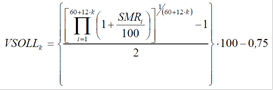 (2) Der Vergleichs-IST-Wert (VIST) und der Vergleichs-SOLL-Wert (VSOLL) berechnen sich analog zum IST-Wert (IST) und zum SOLL-Wert (SOLL), wobei sich der Durchrechnungszeitraum von 60 Monaten um jeweils zwölf Monate pro Folgejahr verlängert. Die Berechnung des Vergleichs-IST-Wertes ist auf Monatsbasis zu berechnen, wenn der IST-Wert auf Monatsbasis berechnet wird. Die Berechnung des Vergleichs-IST-Wertes ist auf Quartalsbasis zu berechnen, wenn der IST-Wert auf Quartalsbasis berechnet wird.