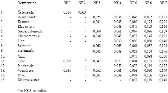Für das von Entnehmern und Einspeisern pro Zählpunkt zu entrichtende Netzverlustentgelt werden jeweils folgende Entgelte je Netzebene (NE) in Cent/kWh bestimmt: