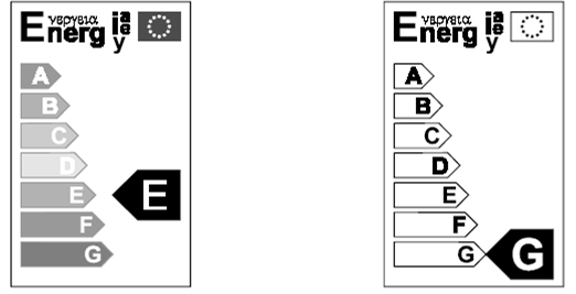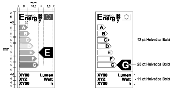 Das Etikett muß einen mindestens 2 mm breiten Rand haben (wie abgebildet). Wenn keine Seite der Verpackung genügend Platz für das Etikett und diesen Rand bietet oder dadurch mehr als 50% der Oberfläche der größten Seite eingenommen würde, dürfen das Etikett und der Rand so weit verkleinert werden, bis diese beiden Bedingungen erfüllt sind. Das Etikett darf jedoch in keinem Fall auf weniger als 40% seiner Originallänge und ‑breite verkleinert werden. Ist die Verpackung für ein solches verkleinertes Etikett zu klein, so muß das Etikett der Lampe oder der Verpackung beigefügt werden. Wo ein Etikett von voller Größe zusammen mit der Lampe ausgestellt ist (zB an dem Regal, auf dem die Lampe ausgestellt ist), darf das Etikett auf der Verpackung entfallen.